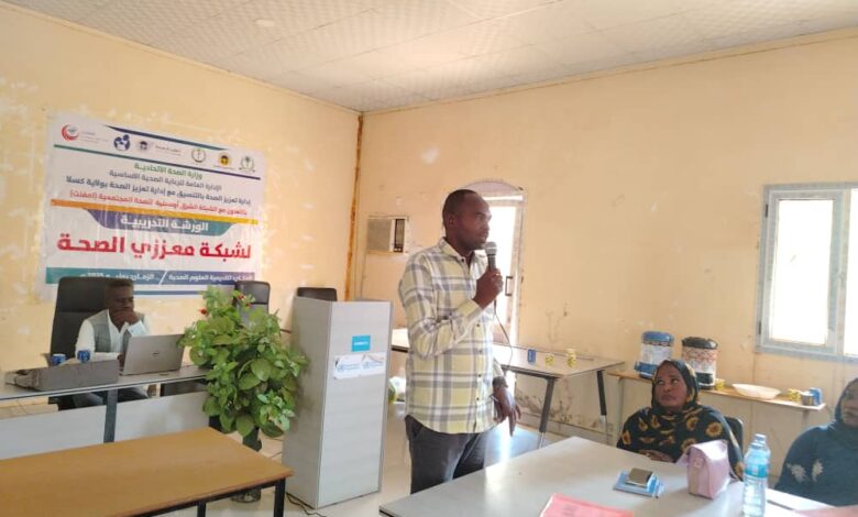 نفذت إدارة تعزيز الصحة بالإدارة العامة للرعاية الصحية الأساسية بوزارة الصحة الاتحادية اليوم بمقر أكاديمية العلوم الصحية بمدينة كسلا وبالتنسيق مع إدارة تعزيز الصحة بالولاية بالتعاون مع الشبكة الشرق أوسطية للصحة المجتمعية (امفنت) ، الورشة التدريبية لشبكة معززي الصحة، على ان تختتم غد الجمعة.