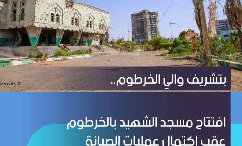 تم اليوم إعادة إفتتاح مسجد الشهيد في الخرطوم بصلاة الجمعة، بعد إكتمال عمليات الصيانة حيث يخطب لصلاة الجمعة ويؤم المصلين الشيخ عاطف عبد القادر يعقب ذلك تلاوة مع الشيخ الزين محمد أحمد ويشرف الافتتاح والي الخرطوم .